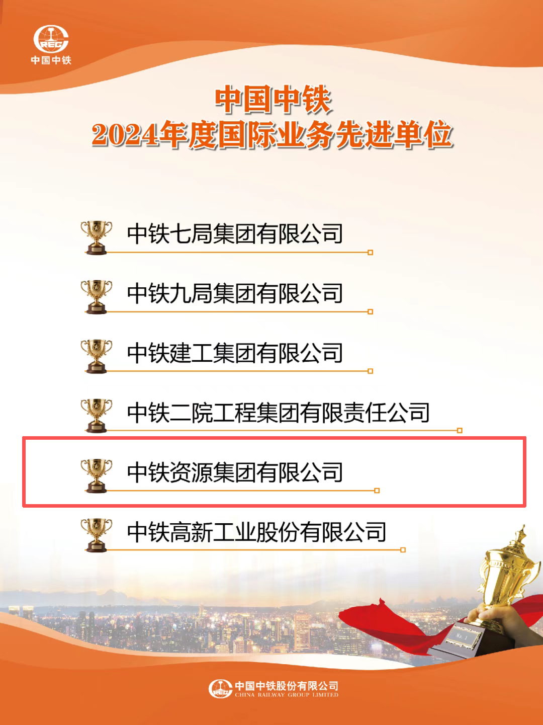 1月15日,中国中铁对海外先进集体和个人进行了表彰,中铁资源3个集体和1名个人榜上有名。其中,中铁资源荣获“中国中铁2024年度国际业务先进单位”、中铁资源华刚矿业荣获“中国中铁2024年度优秀国别公司”、刚果(金)布桑加水电站荣获“中国中铁2024年度先进项目部”、中铁资源廖启华荣获“中国中铁2024年度境外先进个人”。