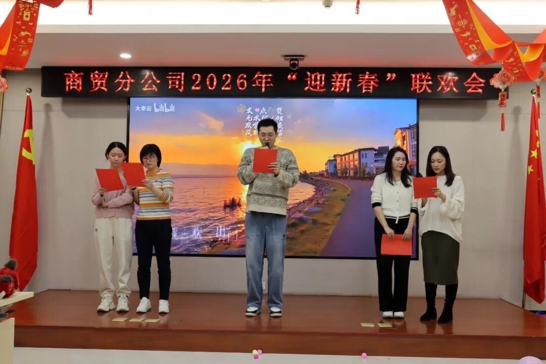 春节前夕,商贸分公司举办2026年迎新春联欢活动,全体员工欢聚一堂,共贺新春。本次迎新春联欢会不仅是一次庆祝新春活动,更是对过去一年工作的总结和回顾,同时也为新的一年注入了新的活力和动力。在新的一年里,商贸分公司全体员工将以更加饱满的热情和昂扬的斗志,迎接新的挑战,为企业高质量发展谱写更加辉煌的篇章!