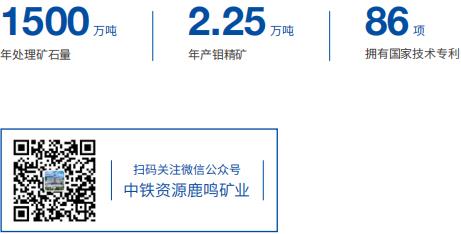 鹿鸣矿业拥有钼矿矿石量 8.14 亿吨,钼金属资源储量 75.18 万吨,资源储量单体规模位于亚洲前列。采矿生产采用露天开采方式,选矿工艺采用半自磨 + 球磨 + 顽石破碎 SABC 工艺流程,拥有钼行业先进的半自磨机、球磨机等采选设备594 台套。生产规模为年处理矿石 1500 万吨,日处理矿石 5 万吨,单系列处理能力居全国领先水平。年产钼精矿 2.25 万吨,主要产品是品位 45%-55% 的优质钼精矿。