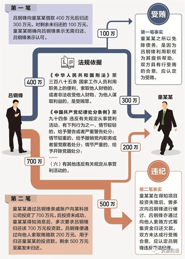 解峰:本案中吕钢锋向管理服务对象童某某借款有两笔。第一笔为吕钢锋向童某某借款400万元后归还300万元,对剩余未归还的100万元,童某某明确向吕钢锋表示无需归还,吕钢锋表示认可。第二笔为童某某经吕钢锋介绍,通过吕钢锋亲戚账户(由吕钢锋实际控制)向某科技公司转账700万元用于投资,后因其他原因导致投资未成功,投资款陆续退回至吕钢锋亲戚银行账户。童某某得知投资未成功后,要求吕钢锋归还该700万元投资款。但吕钢锋谎称退款手续尚在办理中,向童某某隐瞒700万元投资款已退回的事实,并擅自决定将上述资金借给朋友使用,与对方约定收取7%的年息。后吕钢锋朋友企业经营失败,无力归还该钱款。其间,童某某多次向吕钢锋催要该700万元。案发前,吕钢锋通过向他人索取贿赂款200万元,用于归还童某某的投资款。剩余500万元至案发时仍未归还。
