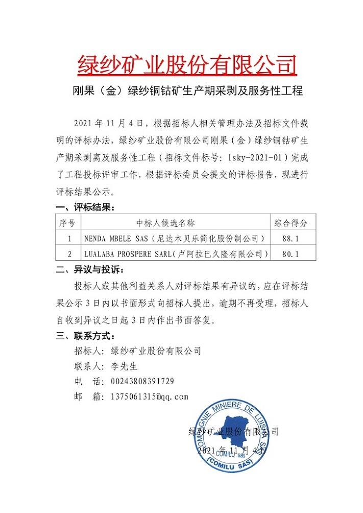 绿纱矿业股份有限公司刚果金绿纱铜钴矿生产期采剥及服务性工程评标结果公示