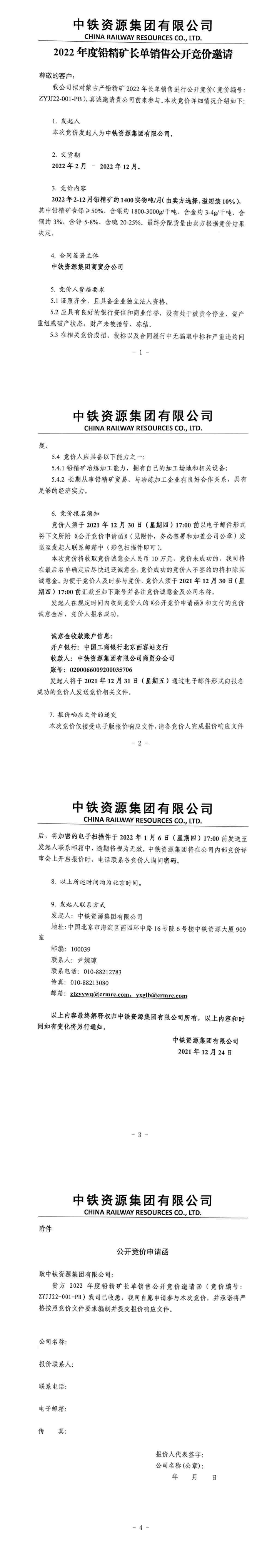 中铁资源集团2022年度铅精矿长单销售公开竞价邀请函