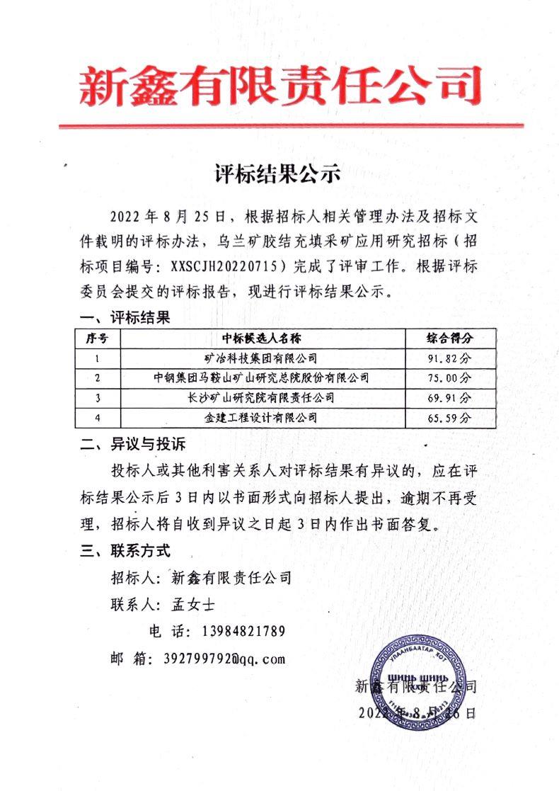 乌兰矿胶结充填采矿应用研究招标评标结果公示
