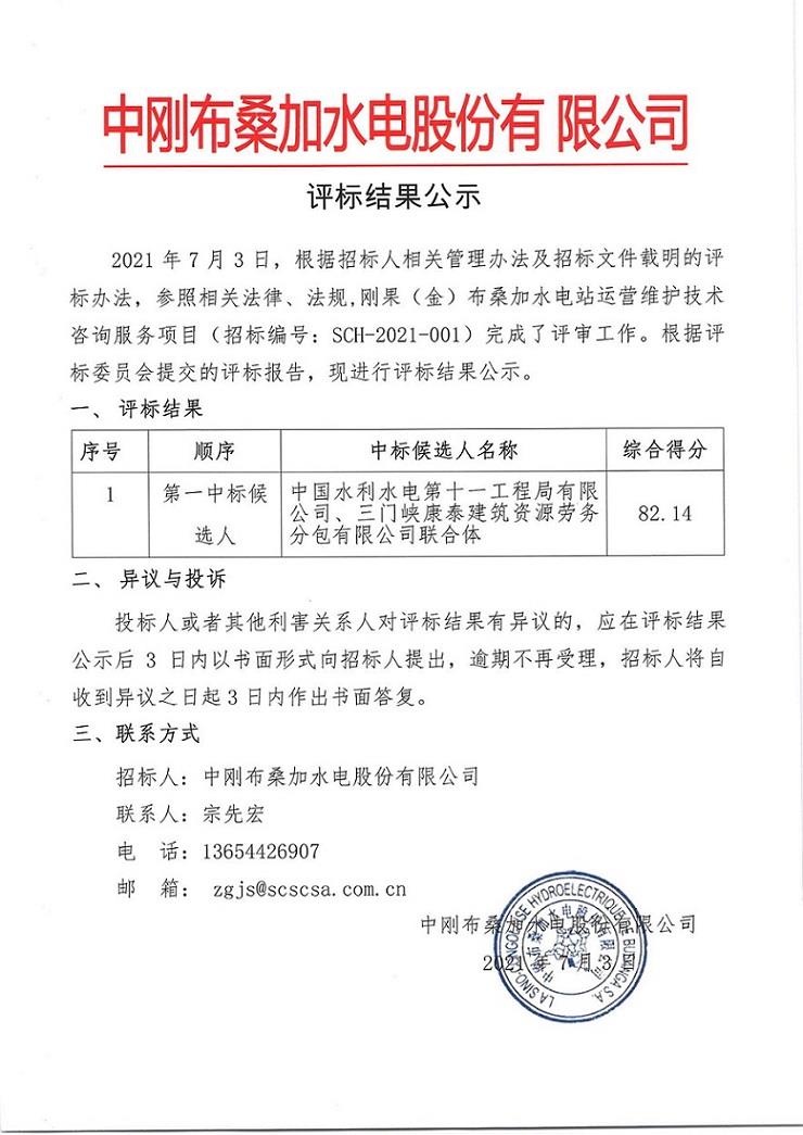 中刚布桑加水电公司刚果金运营维护技术咨询项目招标评标结果公示