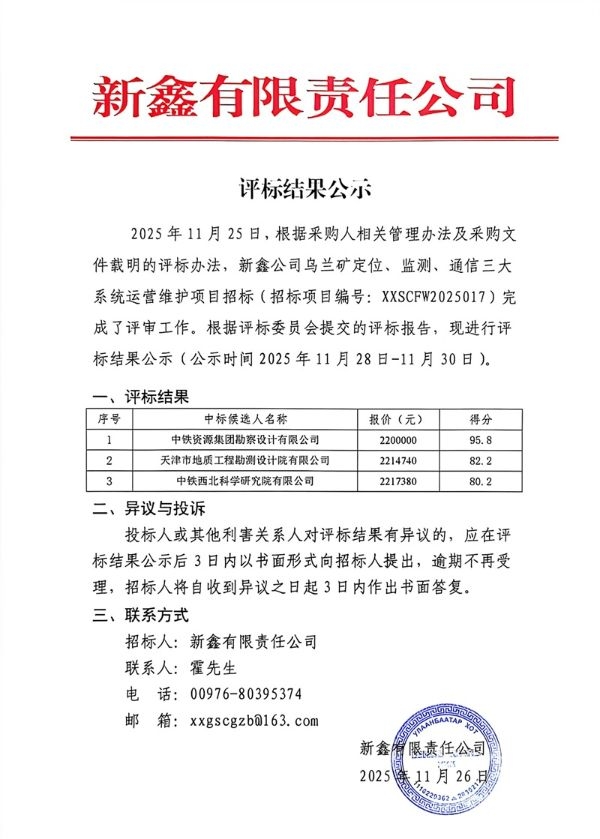 《新鑫公司乌兰矿定位、监测、通信三大系统运营维护项目》评标结果公示