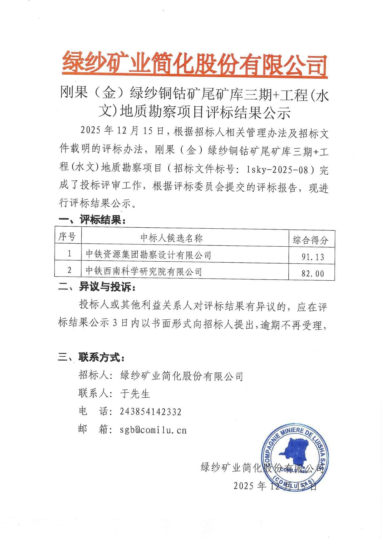 绿纱铜钴矿尾矿库三期工程(水文)地质勘察项目评标结果公示