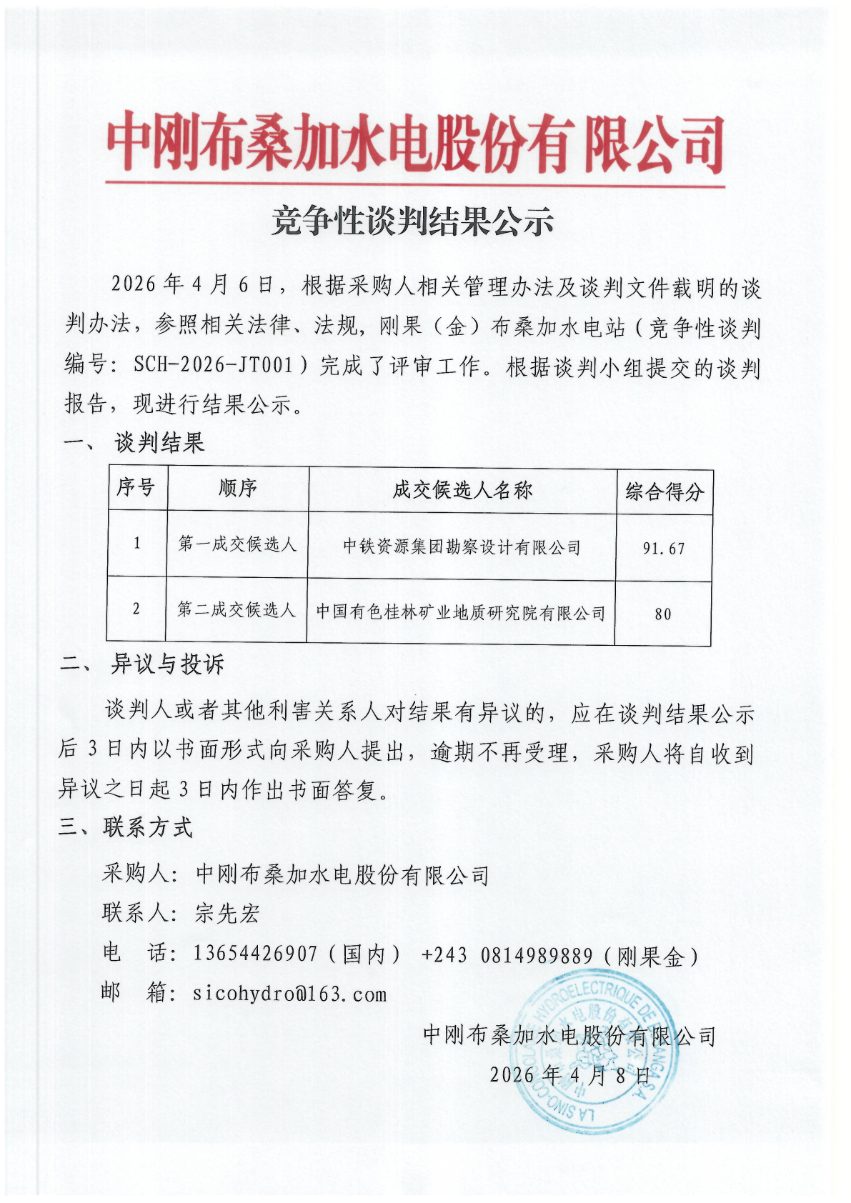 刚果(金)布桑加水电站安全文明提升工程监理服务竞争性谈判结果公示