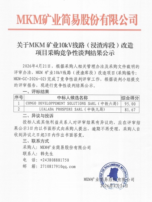 MKM 矿业10kV线路(浸渣库段)改造项目竞争性谈判结果公示